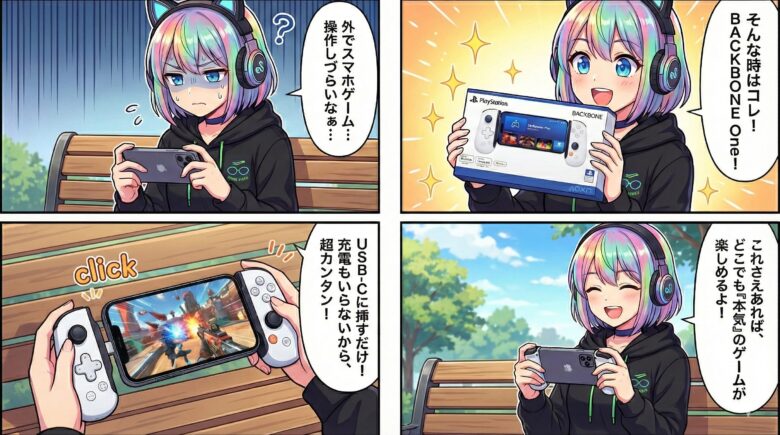 BACKBONE Oneは、スマホに直接装着できるUSB-C接続のコントローラーで、充電不要で使用できます。スマホのUSB-Cポートにコントローラーを挿し込むだけで簡単に接続できるため、外出先でもすぐにゲームを楽しむことができます。これにより、どこにいてもスマホにコントローラーを装着してゲームに集中できる便利なアクセサリーです。