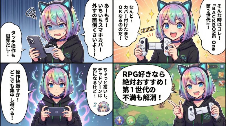 価格が高くスティックのデッドゾーンが大きい事など弱点はありますが、スマホでいつでもどこでも集中して快適に遊びたいならとても便利なスマホ用コントローラーだと感じました。主にRPGなど楽しむ方にはめちゃくちゃおすすめです。特に第1世代の煩わしさを解消したスマホカバーを外さなくていい第2世代がおすすめです。