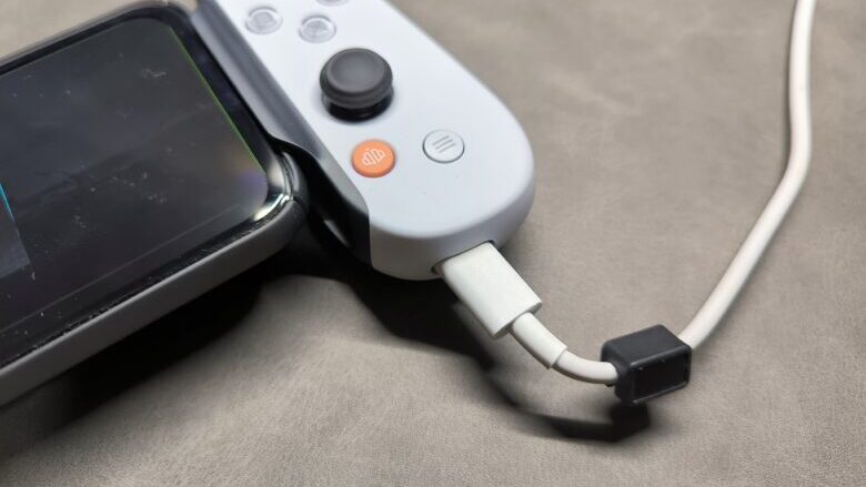 スマホでゲームを遊ぶとバッテリーの消耗が気になります。BACKBONEOneの右下にはUSB-C差込口があり装着したまま充電が可能です。