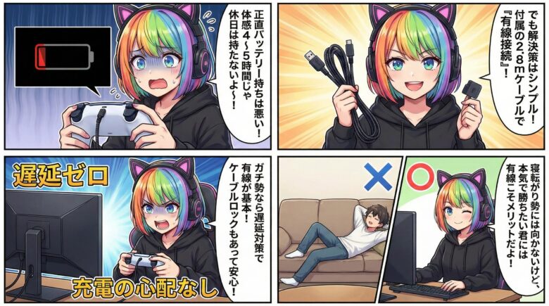 ただ、これには明確な解決策があります。「付属の2.8m編み込みUSBケーブルで、有線接続して遊ぶ」ことです。