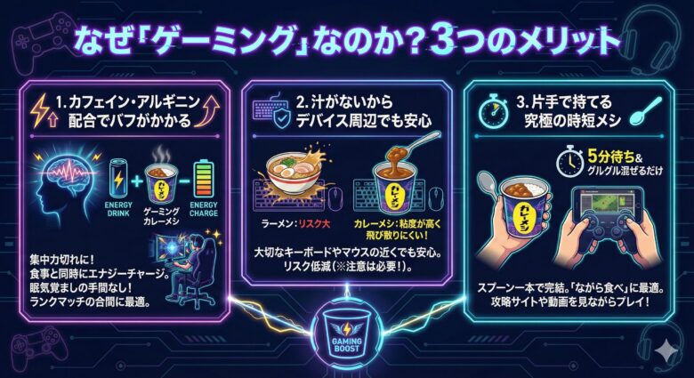 - 「片手で持てる究極の時短メシ」お湯を入れて5分待ち、グルグル混ぜるだけ。スプーン一本で完結するため、スマホで攻略サイトを見たり、別モニターで動画を見たりしながらの「ながら食べ」に最適です。