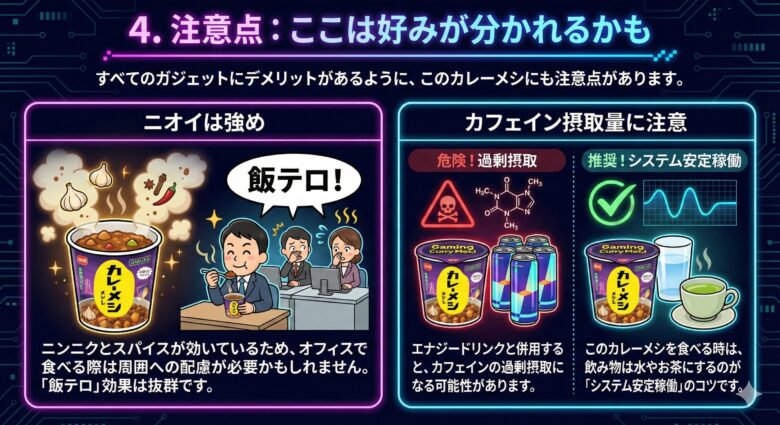 - 「カフェイン摂取量に注意」エナジードリンクと併用すると、カフェインの過剰摂取になる可能性があります。このカレーメシを食べる時は、飲み物は水やお茶にするのが「システム安定稼働」のコツです。