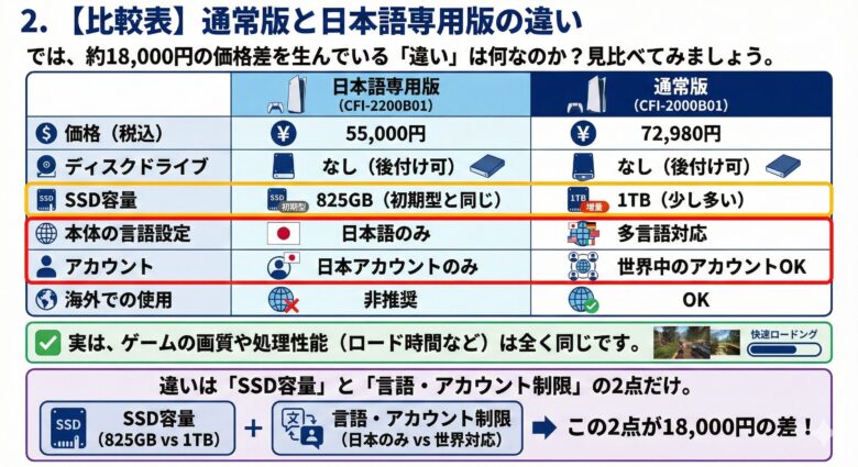 | 比較項目 | 日本語専用版 (CFI-2200B01) | 通常版 (CFI-2000B01) |