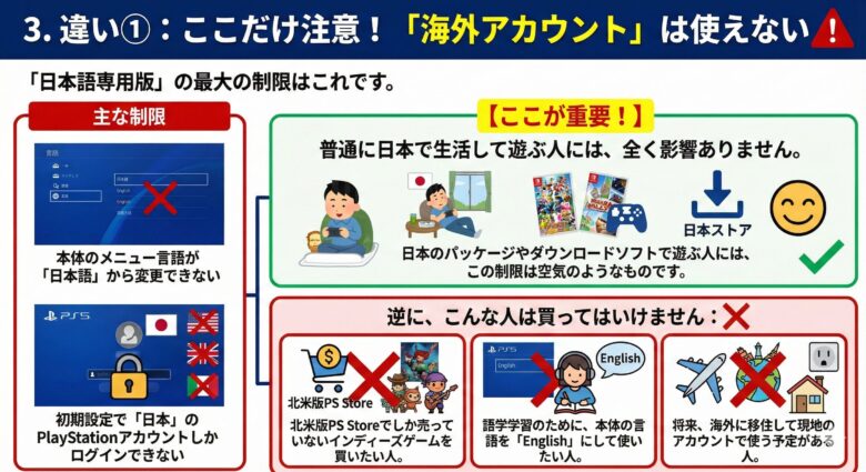 あなたが「日本のアカウントで普通にゲームをするだけ」なら、迷わずこの安い方(日本語専用版)を買ってください。浮いたお金でソフトが3本買えます。
