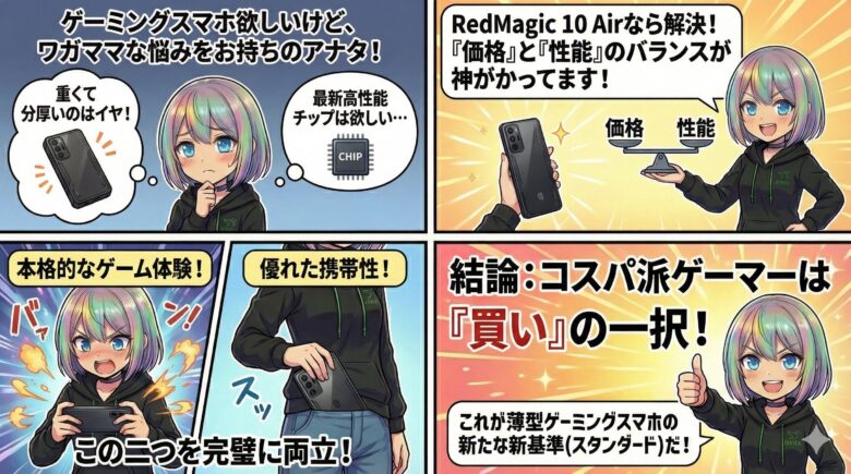 価格と性能のバランスが非常に優れており、「ゲーミングスマホは欲しいけれど、重くて分厚いのは避けたい」「最新の高性能チップを搭載したスマホをコスパ良く手に入れたい」と考えるゲーマーには「買い」の一択です。本格的なゲーム体験と優れた携帯性を両立したRedMagic 10 Airは、薄型ゲーミングスマホの新たなスタンダードとなるでしょう。